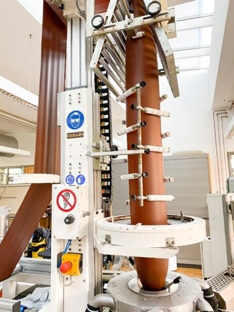 Das Highlight des Instituts für Kreislaufwirtschaft der Bio:Polymere ist die Möglichkeit, den gesamten Herstellungsprozess verschiedener Kunststoffprodukte im Labormaßstab abzubilden und somit auf neuartige Produkte anzupassen. Lokal aufbereitete biogene Rohstoffe können in unserem gleichläufigen Doppelschneckenextruder (links) schonend zu Granulat verarbeitet werden. Dieses Granulat dient anschließend als Ausgangsmaterial für die Herstellung unterschiedlichster Bauteile beispielsweise an unseren Spritzgussmaschinen (mitte) oder von Ein- und Mehrschichtfolien an unserer Blasfolienanlage (rechts).