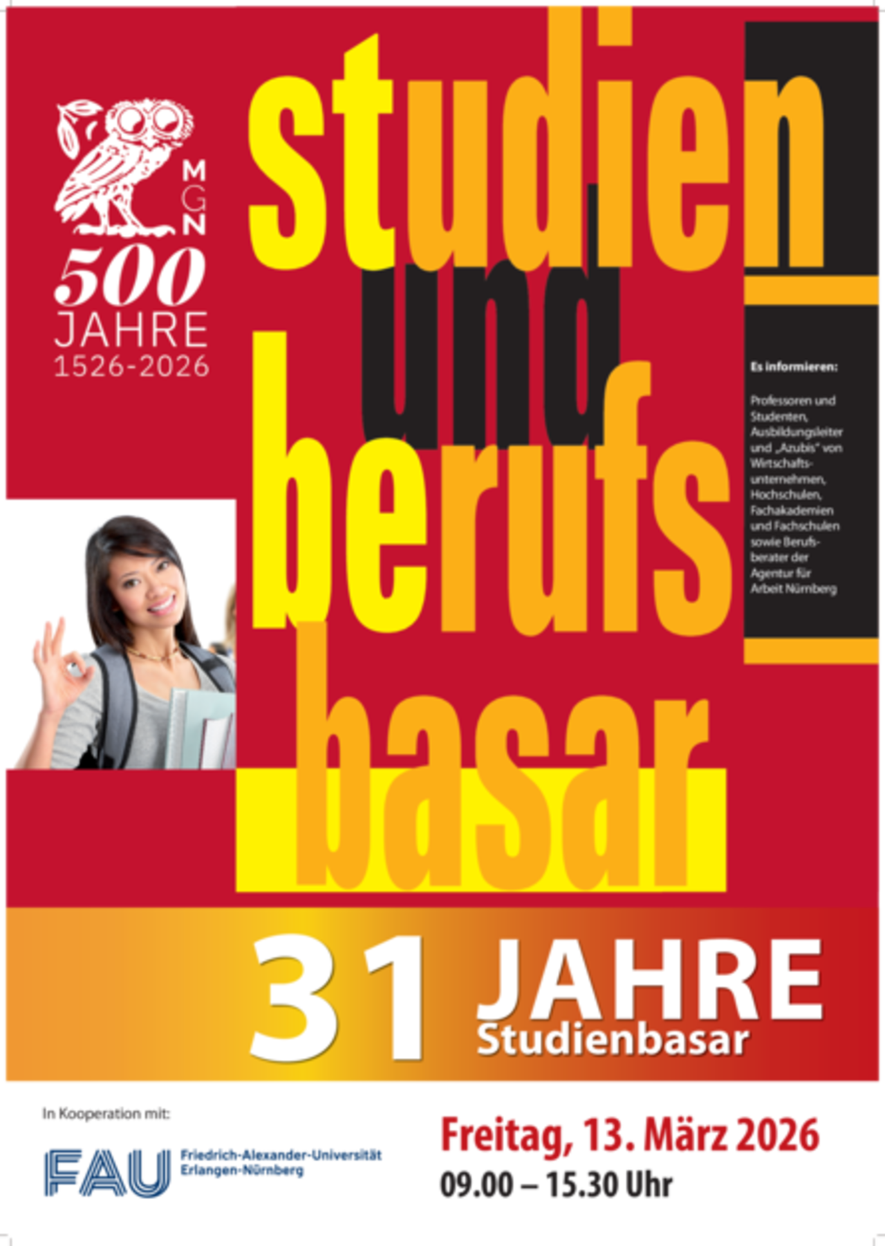Trefft uns auf dem Studienbasar im Melanchthon Gymnasium in Nürnberg und lernt unsere Studiengänge kennen. Unsere Studierenden berichten euch von ihren Erfahrungen in ihrem Studium an der Hochschule Hof und freuen sich auf eure Fragen.