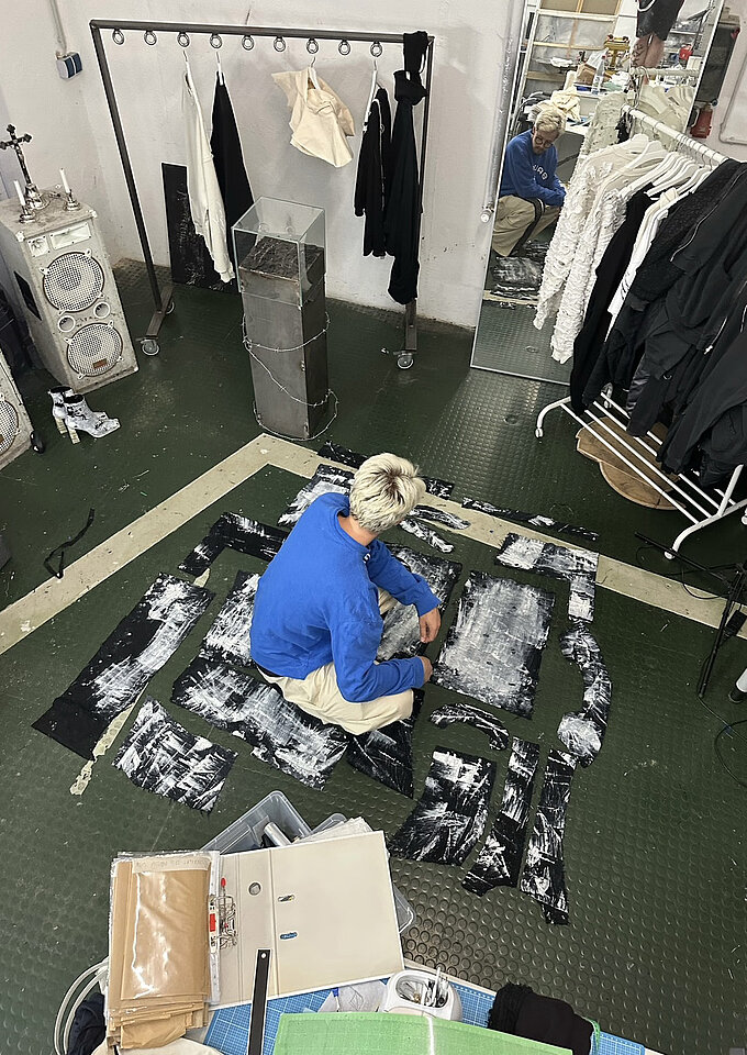 Pascal nahm zusammen mit Timothy Knightly, einem befreundeten brutalistischen Künstler, an dem Event teil. Als Pascal unseren Stand besuchte, kamen wir schnell ins Gespräch. Anfangs tauschten wir uns allgemein über Mode aus, doch nach etwa einer Stunde vertieften sich unsere Gespräche und wurden persönlicher. Pascal erzählte viel über sich und seine Arbeit und schlug schließlich vor: „Schickt mir einfach die Jacke zu, und ich überarbeite sie in meinem Stil.“ Die Jacke, unsere Bauhaus 104 Bomber, ist eines der Schlüsselstücke unserer derzeitigen Kollektion gewesen.