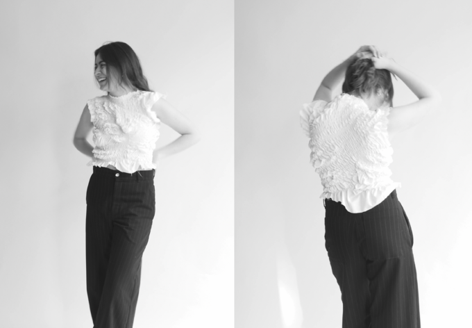 Alle Kleidungsstücke sind aus Reststoffen gefertigt. In den Schnitten finden sich interessante Formen. Die Stücke sollen so konzipiertsein, dass sie flexibel, transformierbar und anpassbar sind, um unterschiedlichen Körpertypen gerecht zu werden und dem:der Träger:in die Möglichkeit zu geben, das Kleidungsstück mit zu gestalten. Zusätzlich gibt es Accessoires, die das Konzept ebenfalls mit aufgreifen.